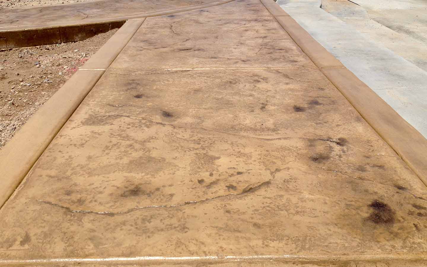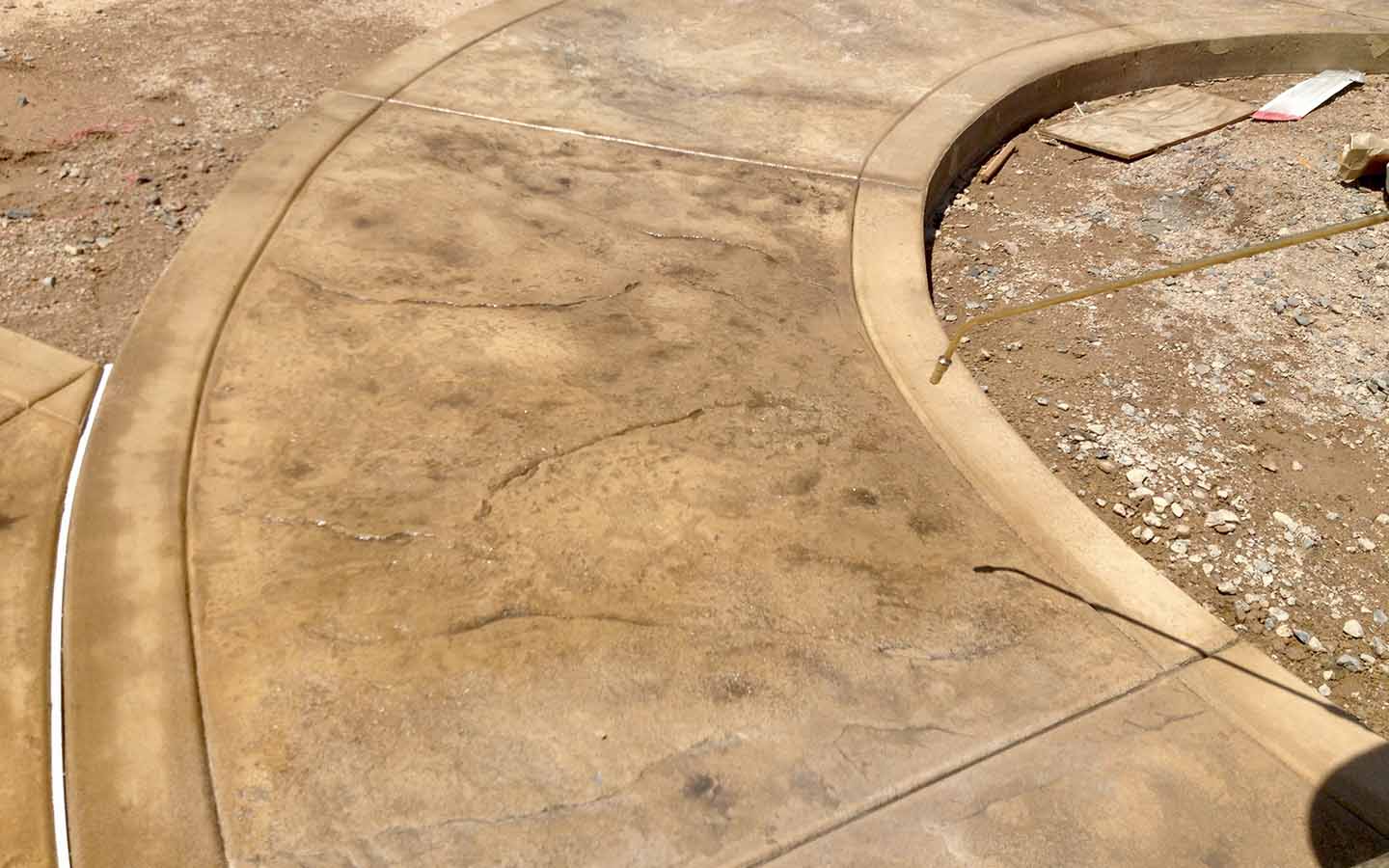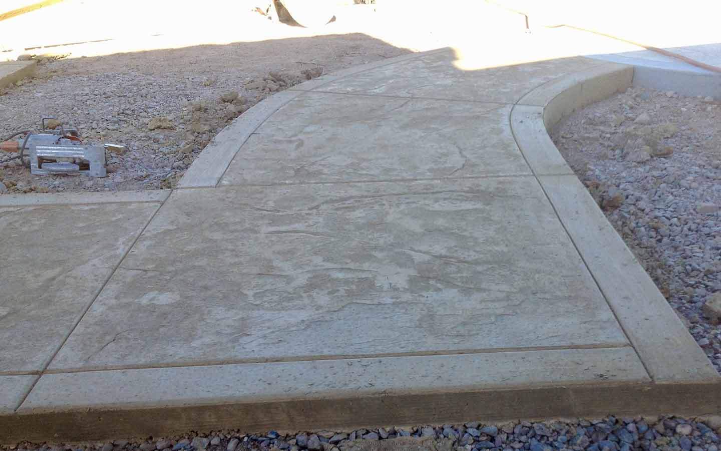 Skin texture patio and walkway. Poured in place stamp, We also overlay-ed 10' of existing patio to match poured in concrete addition. Davis Color Salmon with a charcoal antique. Installed in Avondale Retirement Community.