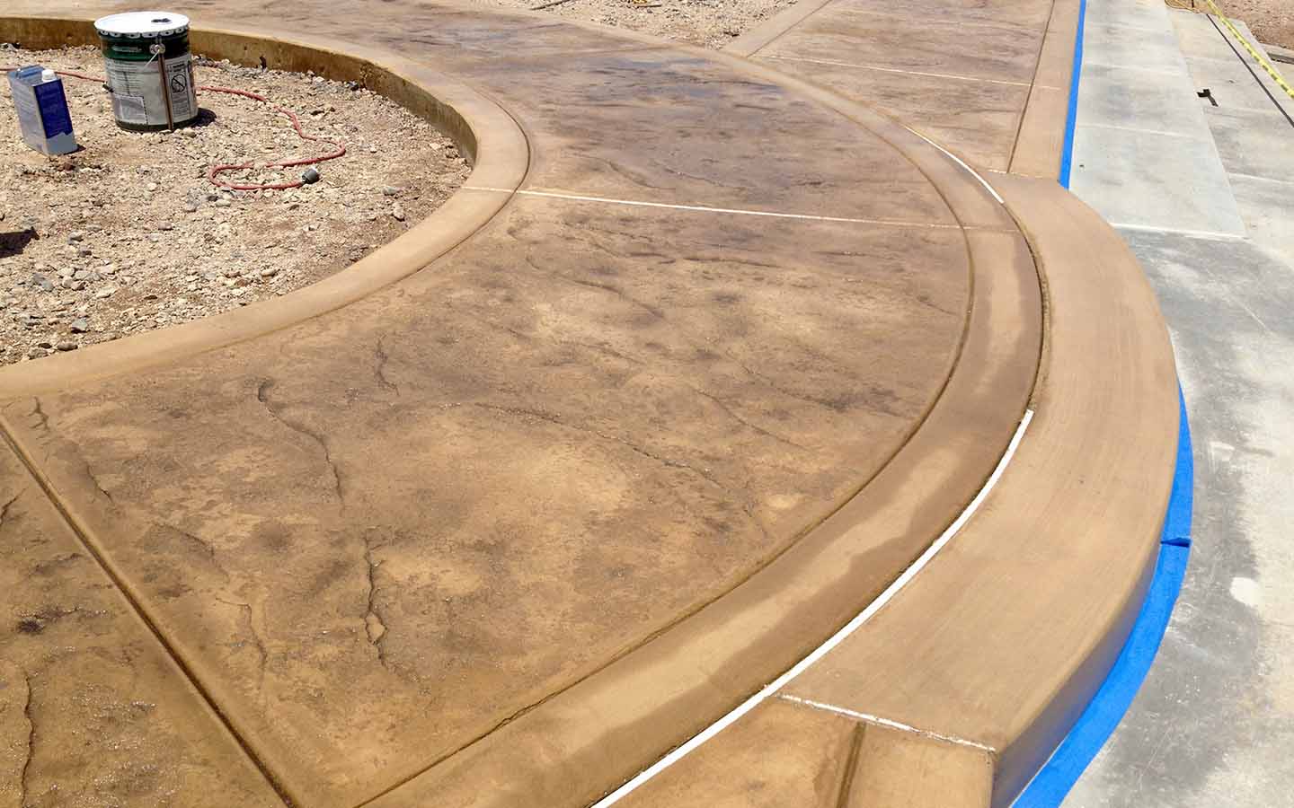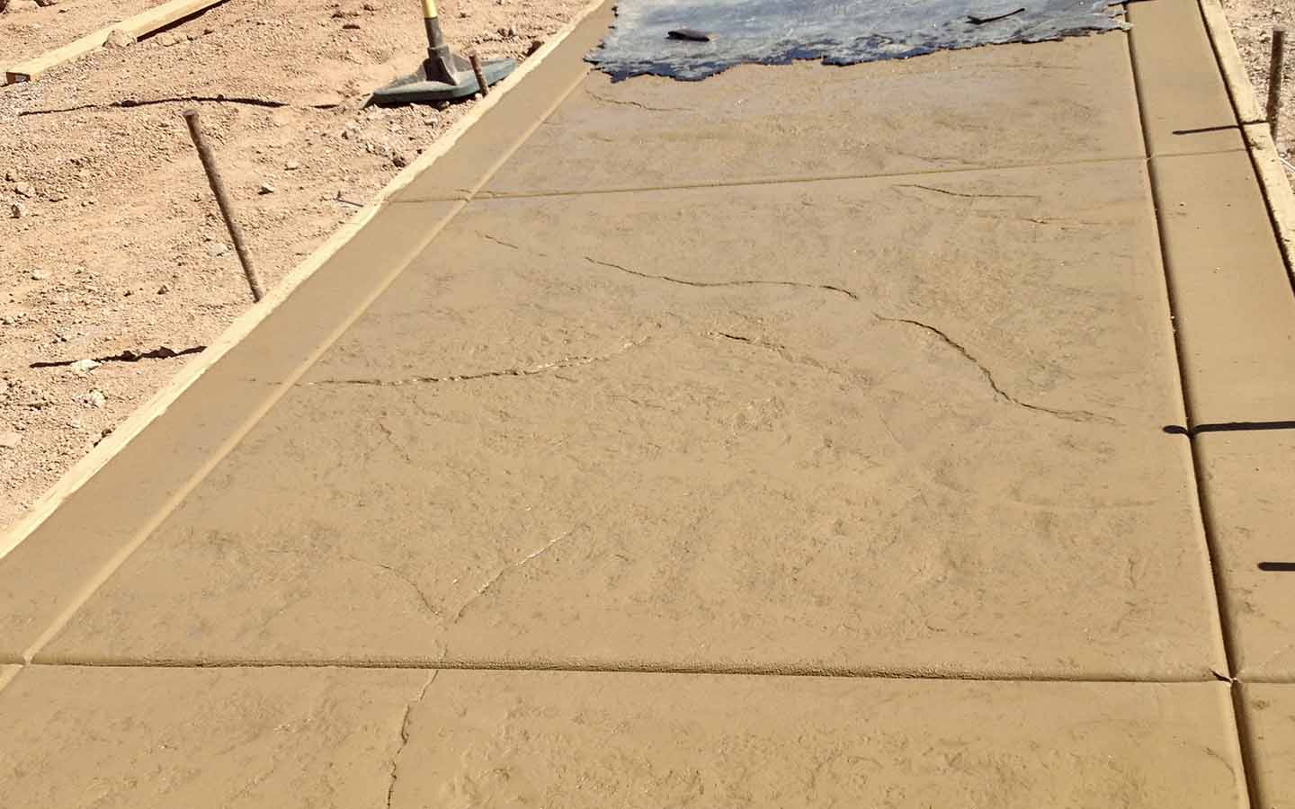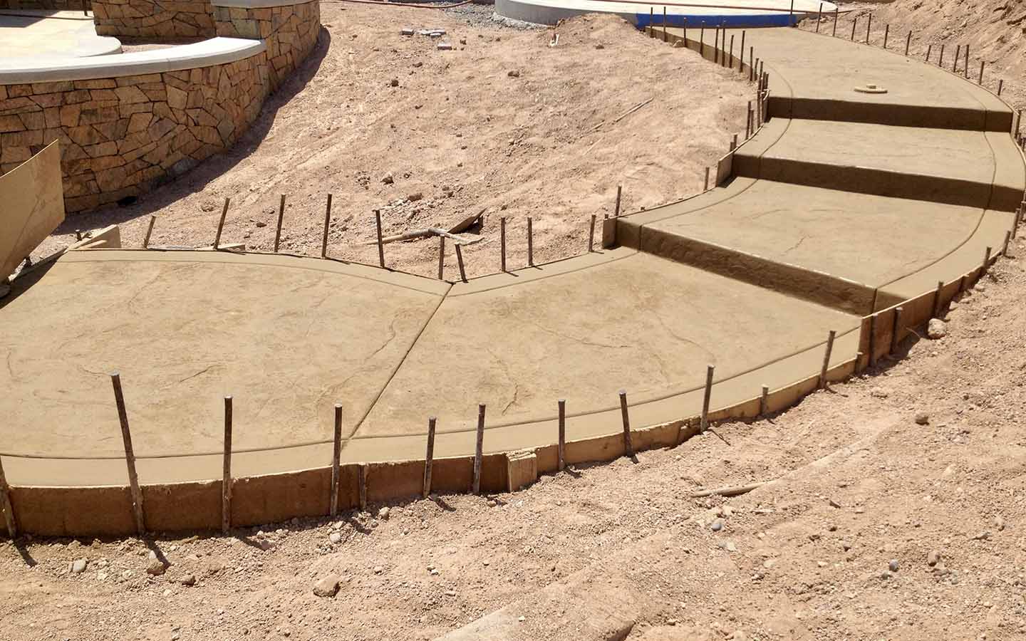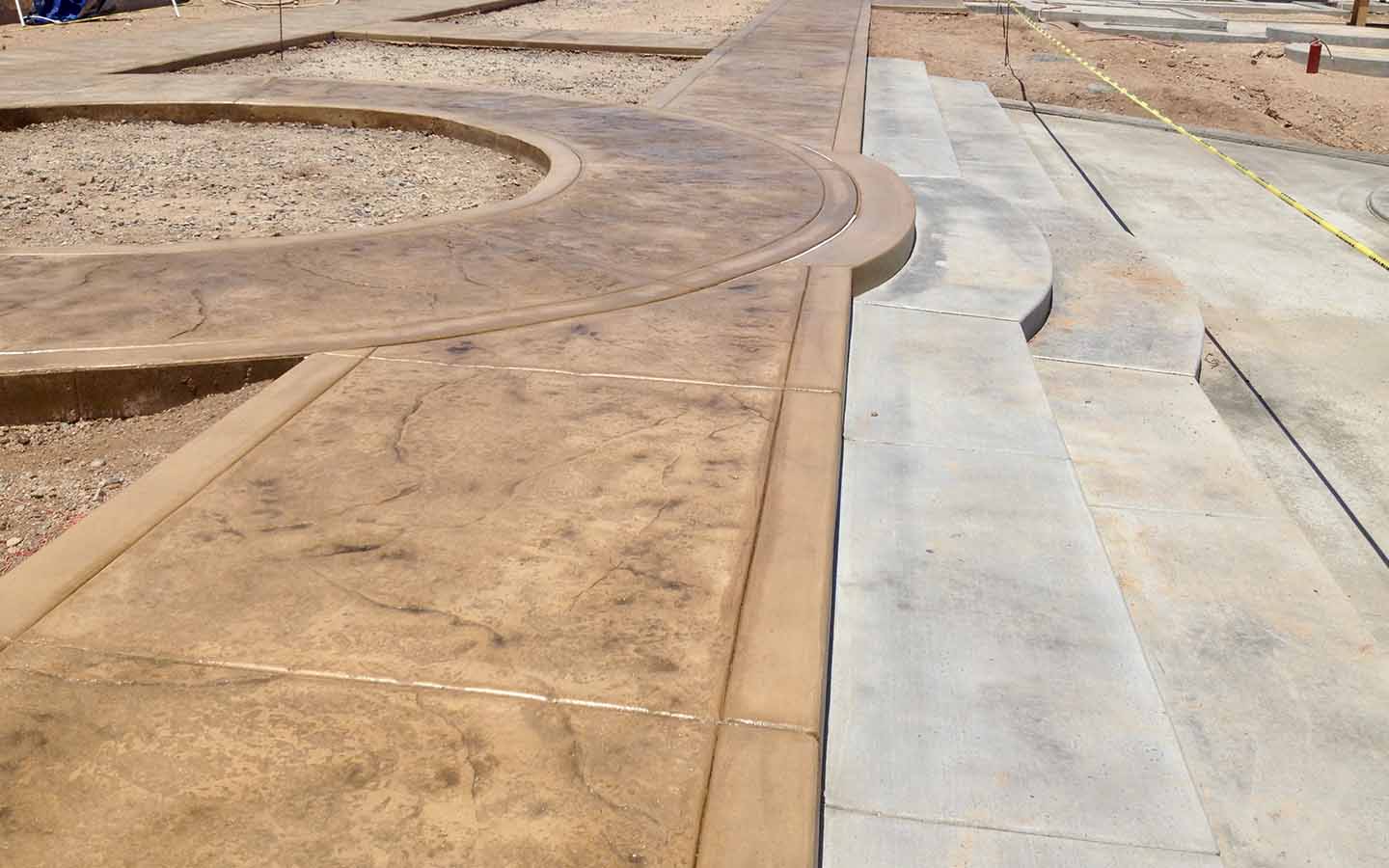 Skin texture patio and walkway. Poured in place stamp, We also overlay-ed 10' of existing patio to match poured in concrete addition. Davis Color Salmon with a charcoal antique. Installed in Avondale Retirement Community.